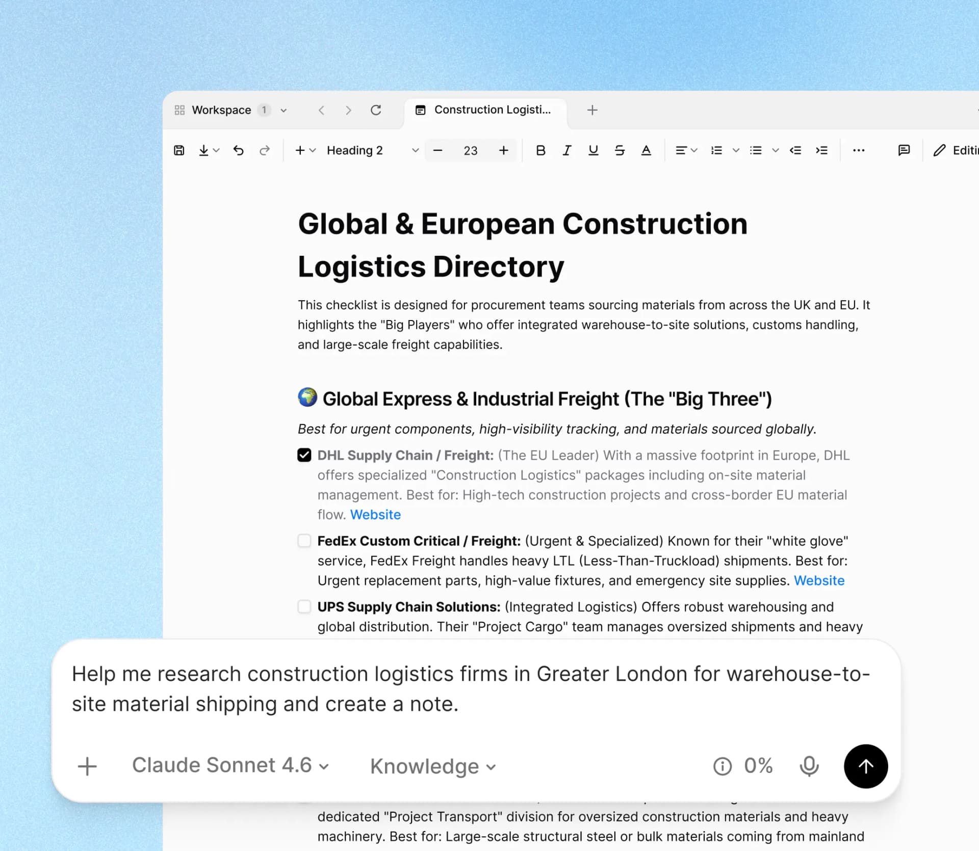 - Workspace to create and editPowerPoint presentations (pptx) and Excel spreadsheets (xlsx) creation and editing capabilities are coming soon within Q1 2026. Notes (markdown, txt) and Word documents (docx) creation and editing are fully available.